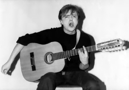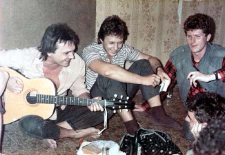 Ленинград, 1986 г. Святослав Задерий и Константин Кинчев на квартирнике (нелегальный в те времена концерт на квартире). |
